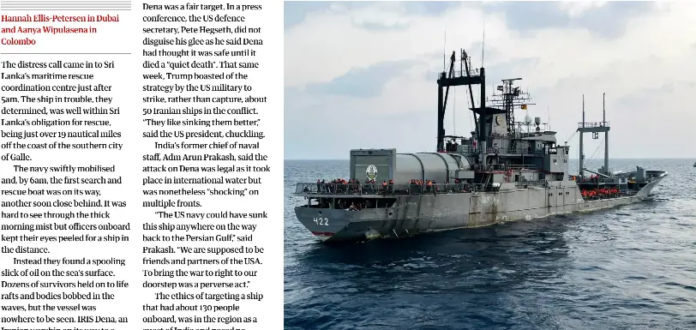 கடந்த மார்ச் 4ஆம் திகதியன்று இந்தியக் கடற்படையுடன் கூட்டுப் பயிற்சியில் ஈடுபட்டுவிட்டு ஈரான் நோக்கித் திரும்பிக் கொண்டிருந்த ‘IRIS Dena’ என்ற ஈரானியக் கடற்படைக் கப்பல் இலங்கை காலிக்கு அண்மையில் உள்ள சர்வதேச கடல் பகுதியில் அமெரிக்க நீர்மூழ்கிக் கப்பல் நடத்திய டொர்பிடோ தாக்குதலில் மூழ்கடிக்கப்பட்டது.